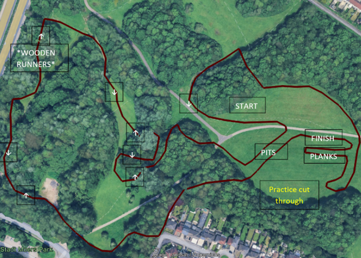The course is run clockwise starting and finishing on the main field. The course is a mix of grassy straights, wooded sections with climbs and descents; all are ridable unless the mud wins or your legs give out! There will be some low planks (147mm to be exact) so everyone can have a go at getting over them. The full course will be used for the Youths unless conditions deteriorate. Practice will be possible during the U12/10/8 races, you’ll be guided to miss out the section by the planks and finish area and go straight into the woods after the pits. Be aware that there are wooden path runners on parts of the course (highlighted on the map), they will be sprayed to for the race. Arrows on the map indicate the ups and downs for the day, along with a techy off camber section to negotiate.